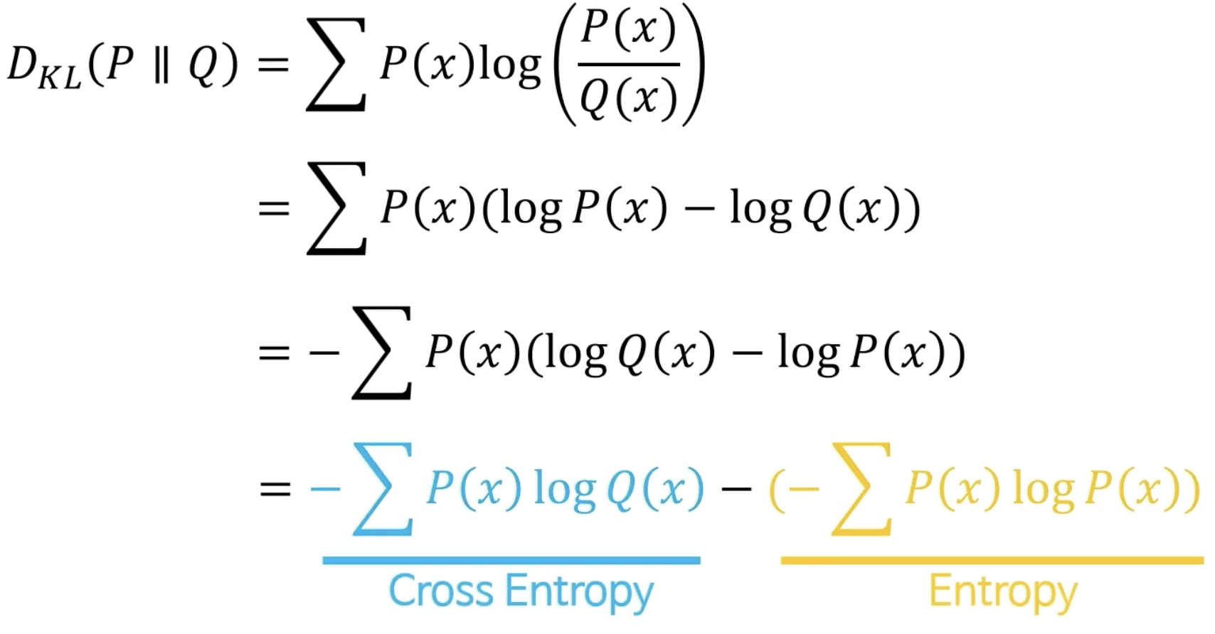 마지막 줄을 보면 두 분포의 Cross Entropy에서 Entropy를 뺀 값이 된다. 즉 KL Divergence는 두 확률분포의 차이를 보여주는 척도이지만 Cross Entropy에서 기준분포 P(x)의 Entropy를 빼줌으로써 (두 분포 사이의 차이에서 기준 분포 자체의 불확실성을 제거함으로써) 두 분포가 얼마나 서로 다른 정보를 가지고 있는지를 순수하게 측정하는 방법이다.