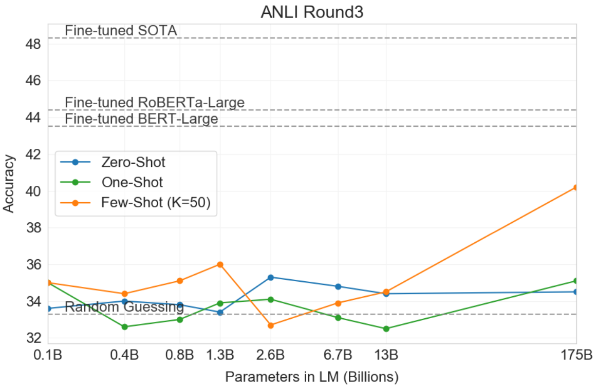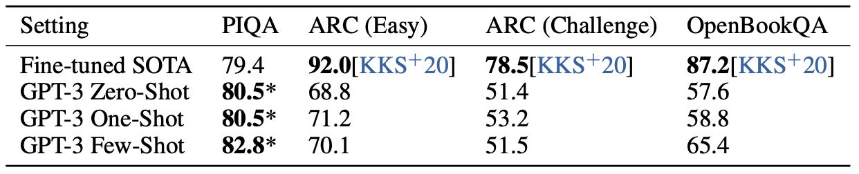 - zero-shot, one-shot, few-shot 세팅에서 강력한 성능을 보여주는 175B 모델을 제시함 (GPT-3)