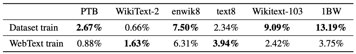 - WebText train data는 평균 3.2% 중복, benchmark train dataset은 평균 5.9% 중복
