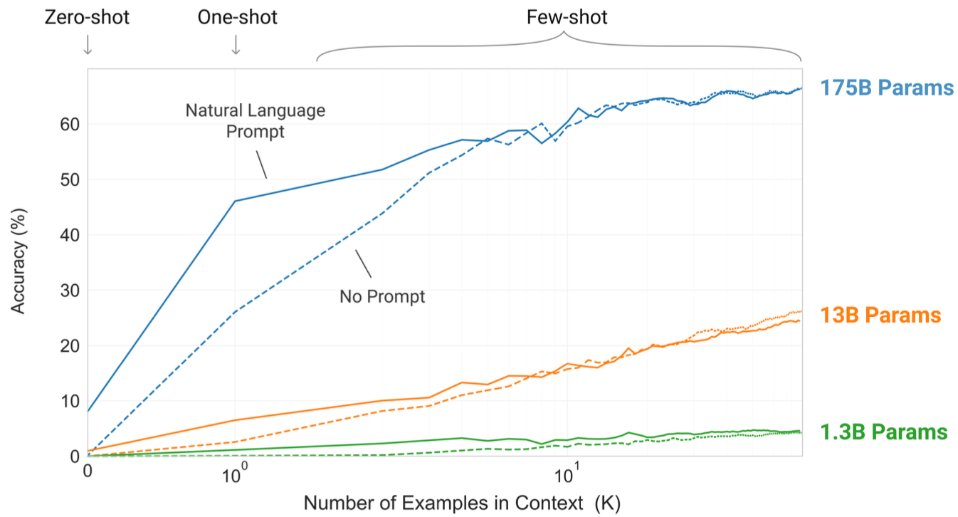 - K(10~100)개의 예제를 context(2,024개 토큰까지)에 주고 추론