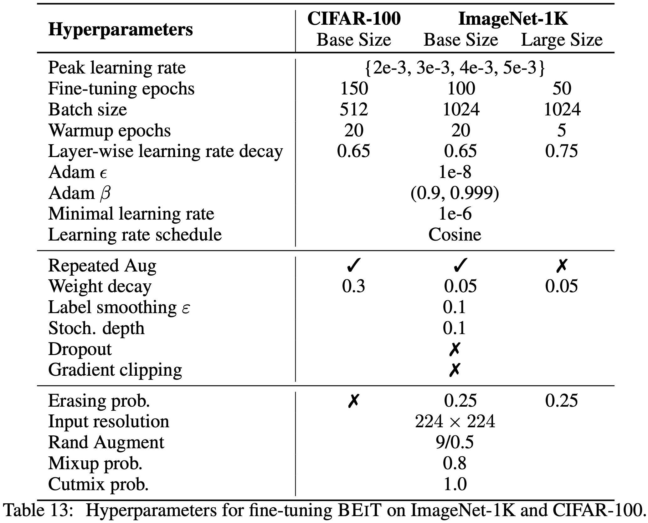 이미지 분류 task는 input 이미지를 다양한 범주로 분류한다. 1,000개의 클래스와 130만 개의 이미지를 가진 ILSVRC-2012 ImageNet 데이터셋에서 BEIT를 평가한다. 공정한 비교를 위해 파인 튜닝 실험에서 DeiT의 대부분의 하이퍼파라미터를 직접 따른다. BEIT는 사전 훈련되었기 때문에 초기부터 훈련하는 것에 비해 파인 튜닝 epoch을 줄였다. 따라서 더 큰 학습률을 사용하고 layer별로 감소시킨다. 자세한 하이퍼파라미터는 부록 H에 요약되어 있다.