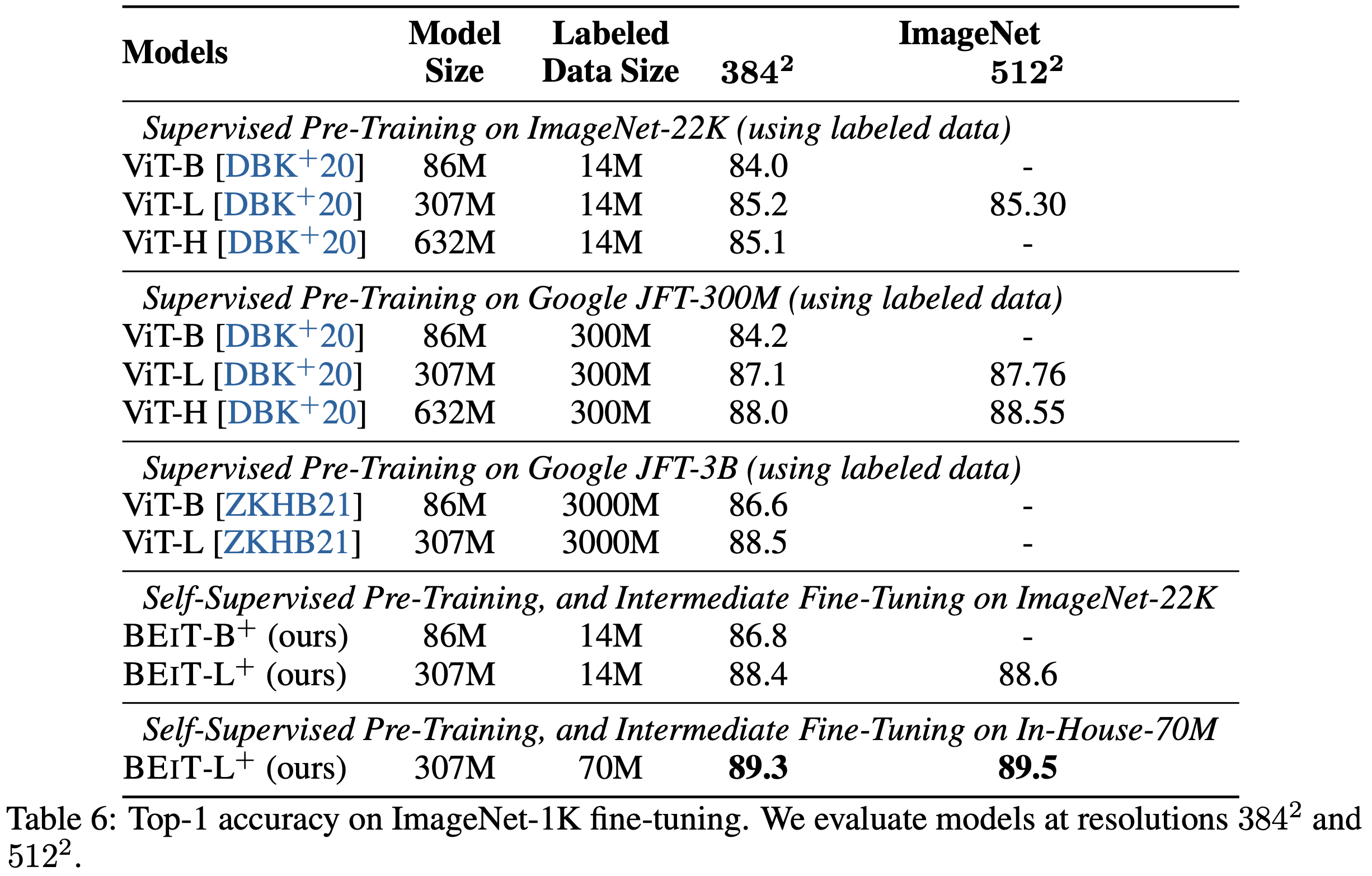 Table 6은 ImageNet 파인 튜닝에서 BEIT와 이전 SOTA supervised pre-training을 비교한다. 구굴의 자체 JFT-300M 및 JFT-3B와 같은 매우 큰 규모의 레이블된 데이터에 크게 의존하는 대신, BEIT 사전 훈련이 ImageNet-22K(1400만)만으로 따라잡을 수 있음을 증명한다. 구체적으로, ImageNet-22K에서 파인 튜닝된 BEIT-L는 구글 JFT-3B에서 훈련된 ViT-L와 비슷한 성능을 달성한다. 게다가, BEIT-L는 자체 7000만 데이터셋에서 중간 미세 조정 후 ImageNet에서 89.5%의 top-1 정확도를 얻는다. 결과는 BEIT 사전 훈련이 필요한 레이블링 노력을 크게 줄이고 대형 vision Transformer의 새로운 SOTA 성능을 발전시킨다는 것을 나타낸다.