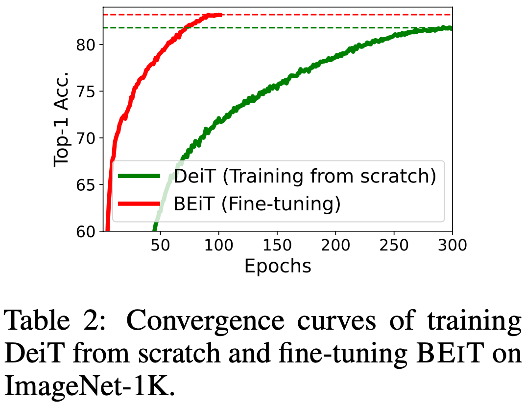 Figure 2는 초기부터 훈련하는 패러다임과 pre-training-then-fine-tuning 패러다임의 수렴 곡선을 비교한다. BEIT를 파인 튜닝하면 더 나은 성능을 달성할 뿐만 아니라 초기부터 DeiT를 훈련할 때보다 훨씬 더 빨리 수렴한다는 것을 발견했다. 게다가, BEIT를 파인 튜닝하면 매우 적은 epoch 내에 합리적인 수치를 도달할 수 있다.