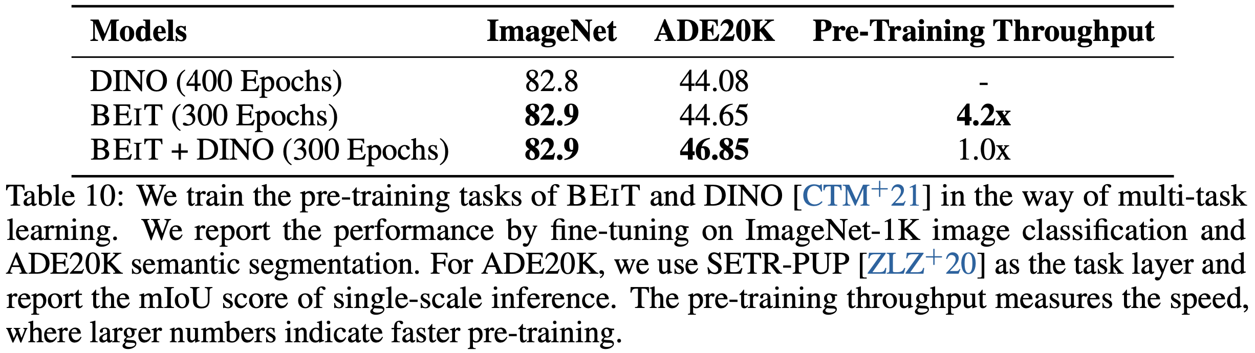 BEIT와 DINO의 pre-training task를 multi-task 방식으로 함께 훈련한다. Table 10에 나타난 바와 같이, masked image modeling을 DINO와 결합하면 ADE20K에서 semantic segmentation이 향상되고 ImageNet 분류에서는 유사한 결과를 얻는다. 게다가, BEIT는 사전 훈련 속도 측면에서 더 효율적인데, 이는 DINO self-distillation과 multi-crop 증강을 위해 Transformer 파라미터의 두 복사본을 사용하기 때문이다. BEIT와 BEIT+DINO 간의 처리량 비교를 위해 batch size를 동일하게 설정했다. BEIT는 또한 메모리 효율성이 더 높기 때문에 더 큰 배치 크기를 사용하여 GPU 카드를 완전히 활용할 수 있으며 이는 실제로 보고된 숫자보다 더 큰 속도 향상을 얻을 수 있다.