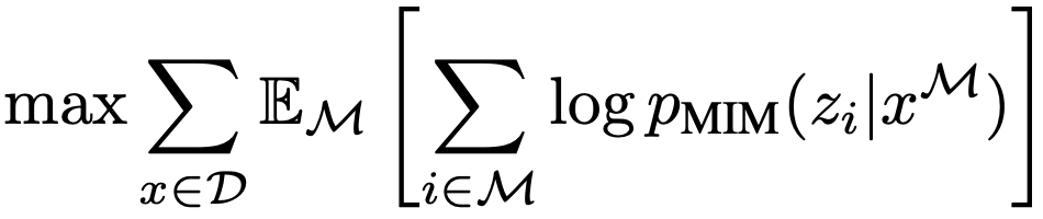 여기서 D는 training corpus이고 M은 무작위로 마스킹된 위치를 나타내고 x^M은 M에 따라 마스킹된 손상된 이미지이다.