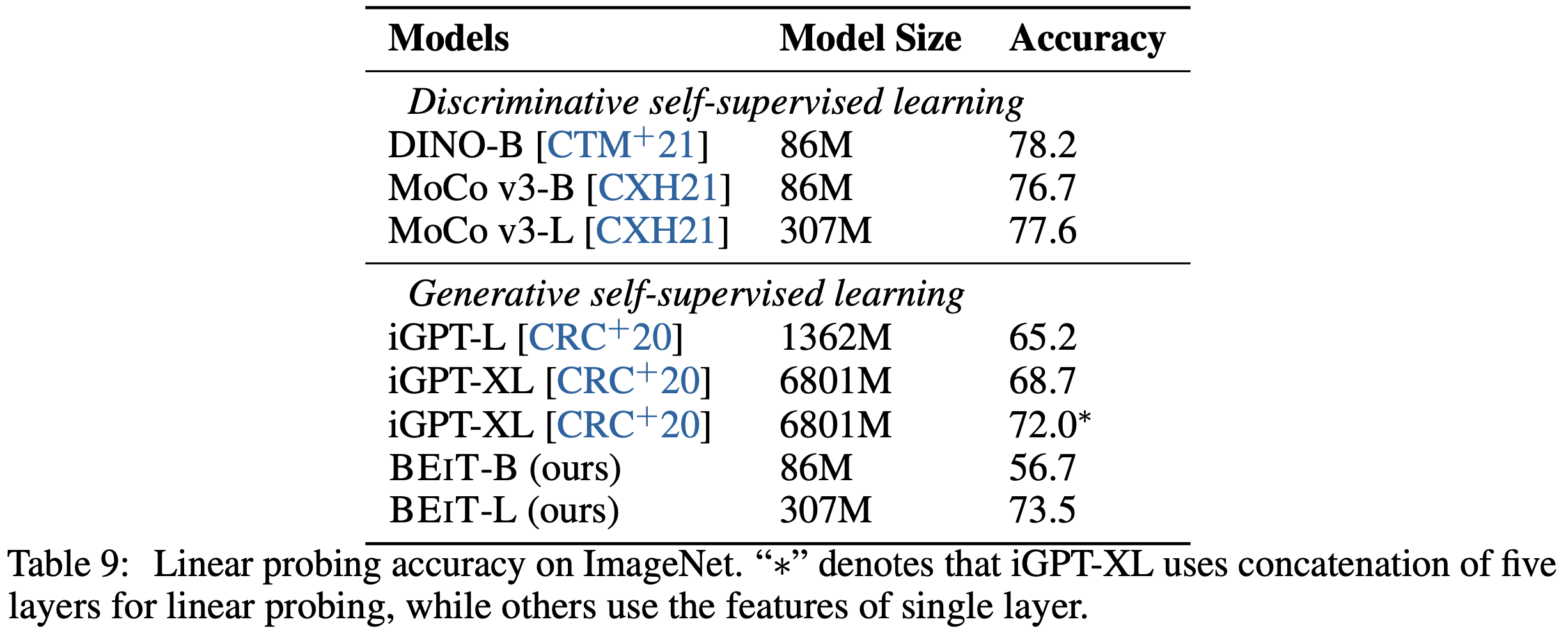 다양한 사전 훈련된 vision Transformer에 대해 ImageNet에서 linear probe를 평가한다. BEIT를 두 가지 주요 연구, 즉 discriminative 및 generative self-supervised 학습과 비교한다. 첫 번째는 contrastive 학습과 self distillation과 같은 판별 학습을 사전 훈련에 적용한다. 위의 방법들은 일반적으로 이미지 수준의 특징을 전역 벡터로 집계하는 법을 배우며, 이는 linear probing에 비교적 적합하다. 반면에 iGPT와 본 논문 방법과 같은 두 번째 작업은 일반적으로 이러한 전역 특징 집계를 사전 훈련하지 않아 linear probing을 어렵게 만든다.