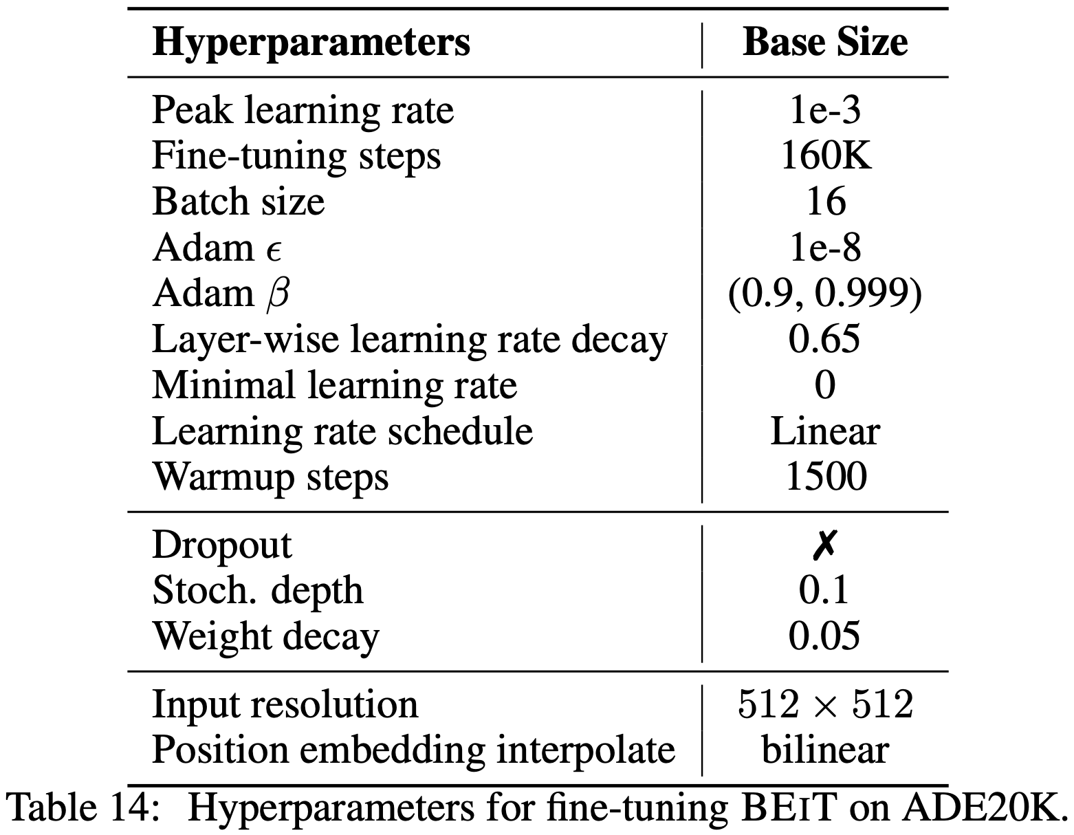 semantic segmentation은 input 이미지의 각 픽셀에 해당하는 클래스를 예측하는 것을 목표로 한다. ADE20K 벤치마크에서 BEIT를 평가하며 이 데이터셋은 25,000개의 이미지와 150개의 의미론적 범주를 포함한다. 모든 의미론적 범주에 대해 mean Intersection of Union(mIoU) 지표를 보고한다. section 2.6에서 설명한 바와 같이, SETR-PUP에서 설명된 task layer와 대부분의 하이퍼파라미터를 직접 따른다. ADE20K에서는 Adam을 최적화기로 사용한다. 학습률은 계층별 감소와 유사하게 1e-3으로 설정된다. 160,000 step동안 파인 튜닝을 수행한다. batch size는 16이다. 자세한 하이퍼파라미터는 부록 I에 설명되어 있다.