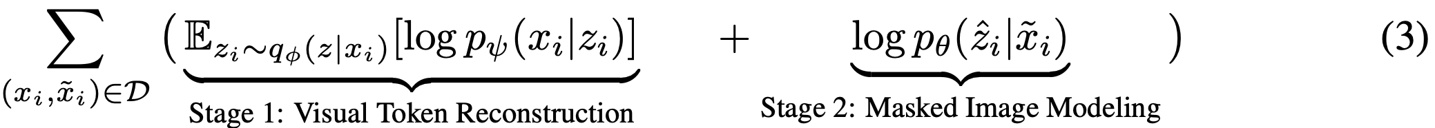 (3) p(z|x~)는 마스킹된 이미지를 기반으로 시각적 토큰을 복원하는 것으로, 이는 MIM pre-training task이다.