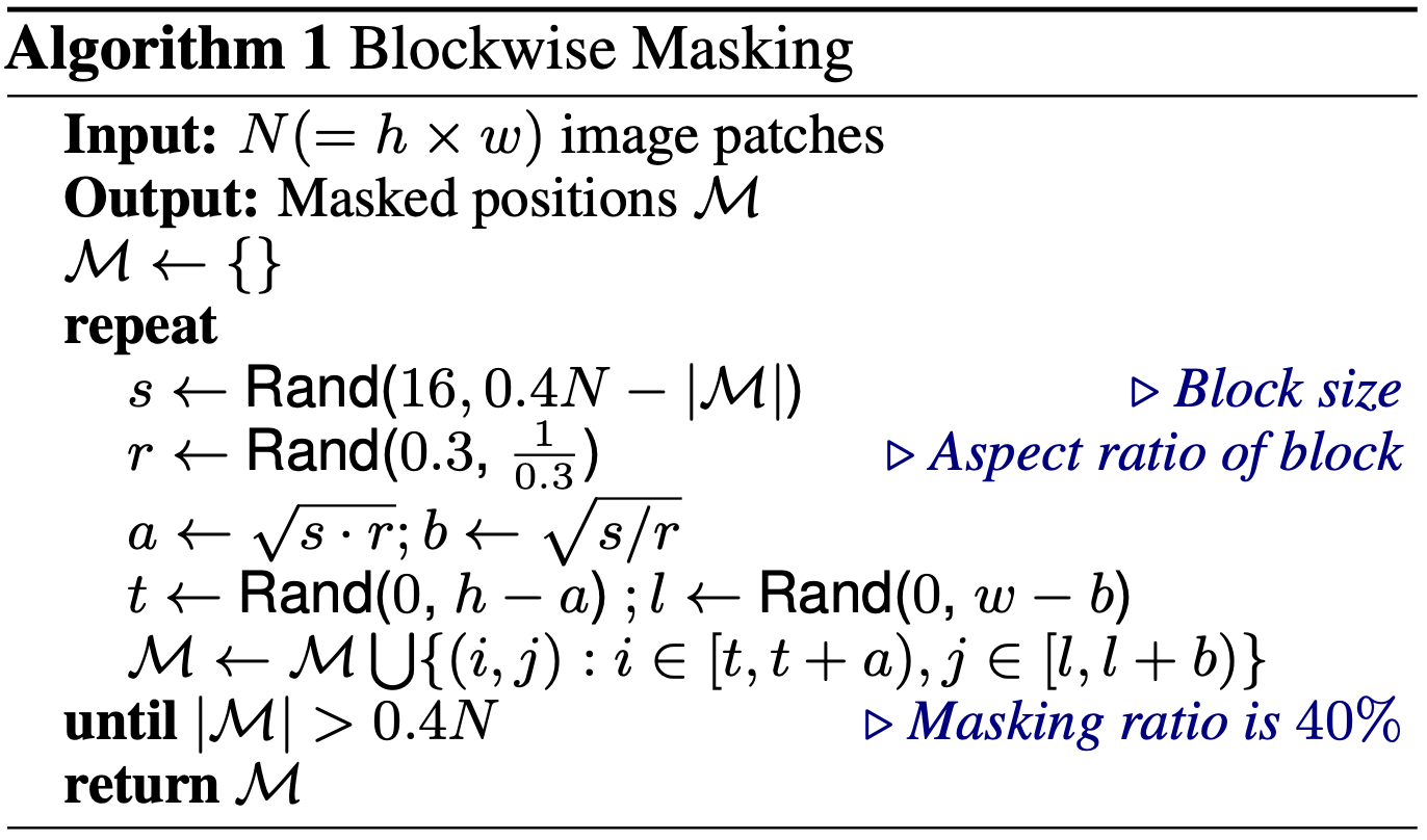 마스킹된 위치 M을 무작위로 선택하는 대신, 본 연구에서 블록 단위 마스킹을 사용한다. Algorithm 1에 요약된 것처럼, 각 블록마다 이미지 패치의 블록을 마스킹한다. 각 블록에 대해 패치의 최소 수를 16으로 설정한다. 그런 다음 마스킹 블록의 종횡비를 무작위로 선택한다. 위의 두 단계를 0.4N, 즉 총 이미지 패치 수 N의 40%를 얻을 때까지 반복한다.