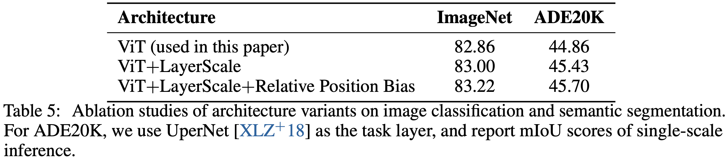 Table 5에서 알 수 있듯이, LayerScale과 상대적 position bias 모두 ImageNet 분류와 ADE20K semantic segmentation 성능을 향상시킨다. 향상된 아키텍처를 BEIT+로 표시하고 부록 B의 실험에 사용한다. vanilla Transformer가 수십억 개의 파라미터로 모델을 확장할 때 가장 안정적이라는 것을 경험적으로 알게 되었기 때문에 초대형 모델에는 LayerScale을 사용하지 않는다.