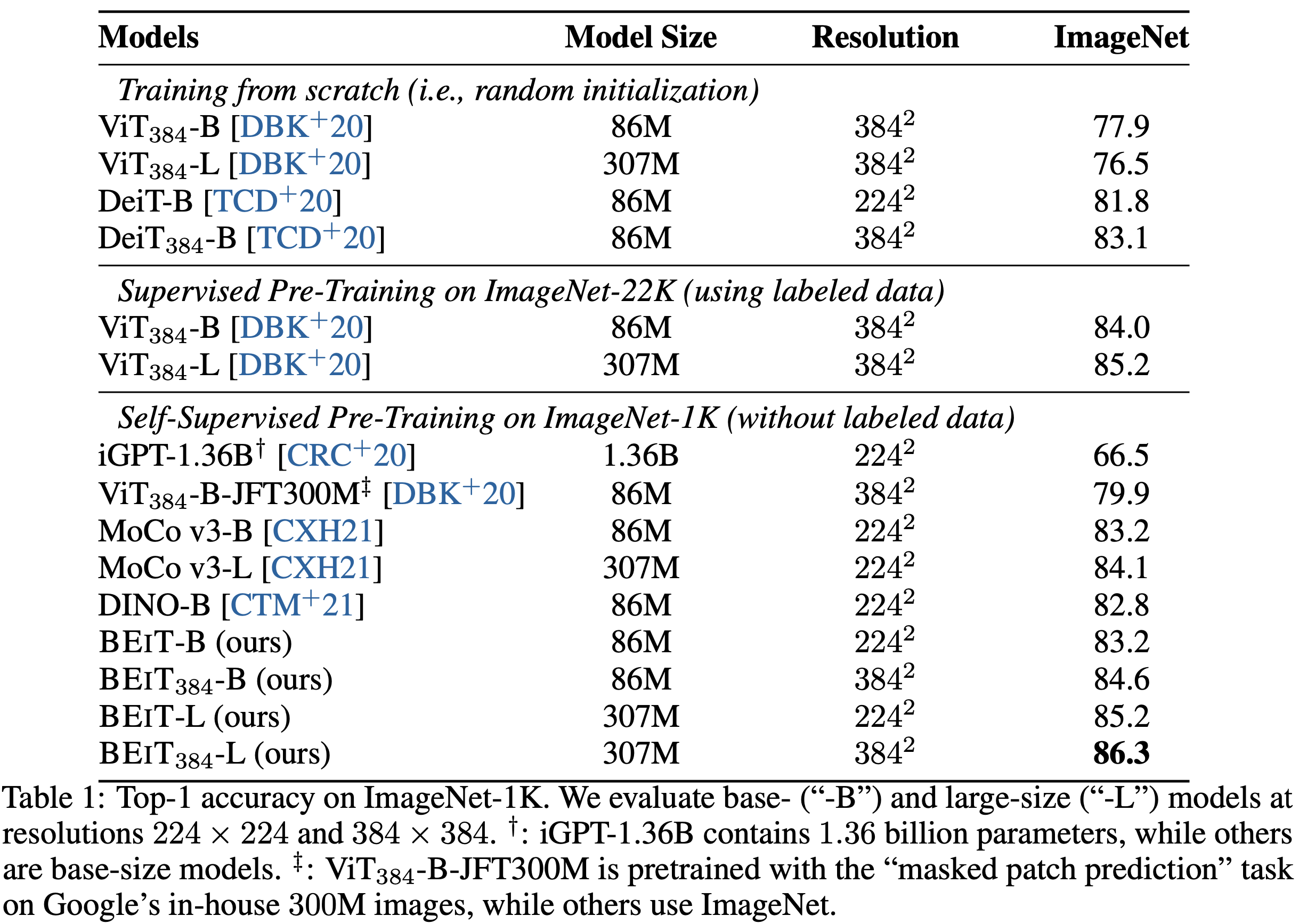 Table 1은 이미지 분류에 대한 top-1 정확도를 보고한다. BEIT를 무작위로 초기화, supervised pre-training 및 이전 self-supervised learning으로 훈련된 vision Transformer와 비교한다. 비교된 모든 모델은 기본 크기이며 iGPT는 13억 6천만 개의 파라미터를 가진다. 비교 목적으로 사전 훈련은 ImageNet에서 수행되며, ViT-JFT300M은 구굴의 3억 개 이미지에서 사전 훈련된다.
