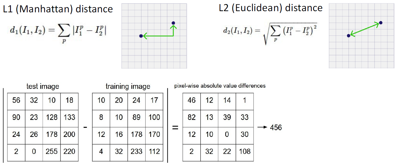 Distance Metric은 많은 것들이 있는데 L1 및 L2 distance를 가장 흔히 사용한다.