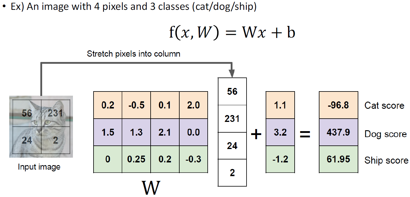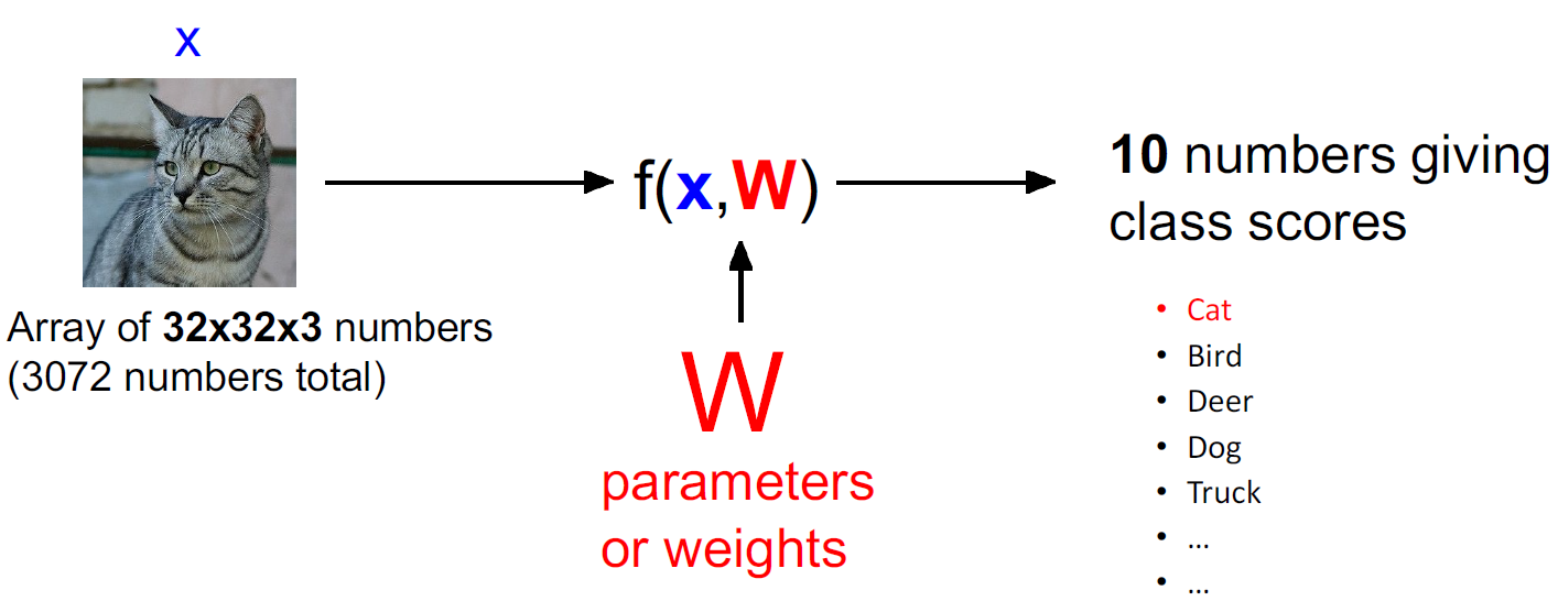 이미지 x가 주어지면 파라미터 혹은 가중치에 의해 각 class에 대한 score가 나오도록 한다.