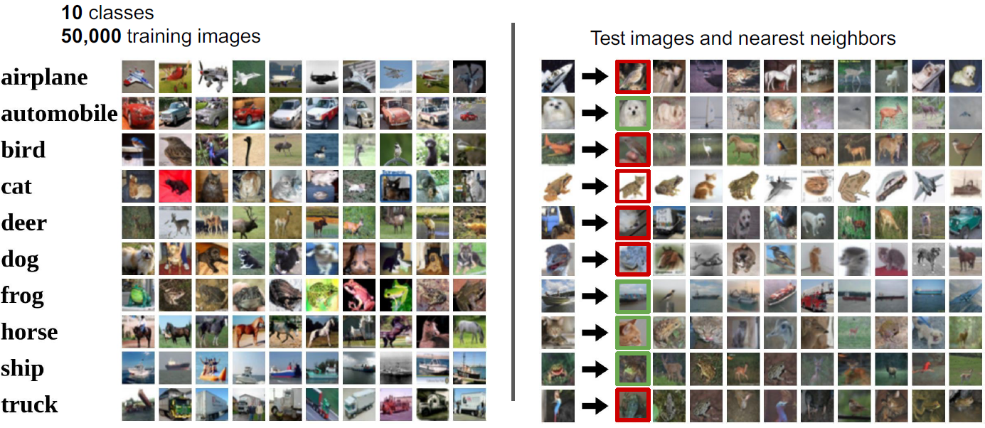 test data 개수만큼 for문이 돌아가고 train data가 50,000개가 있다고 치면 각 test data마다 50,000개의 train data와의 거리를 모두 계산해야한다. 그래서 test 시, 엄청 느린 속도를 가지고 있다. (사실 잘 안사용하는 방법이다..!)