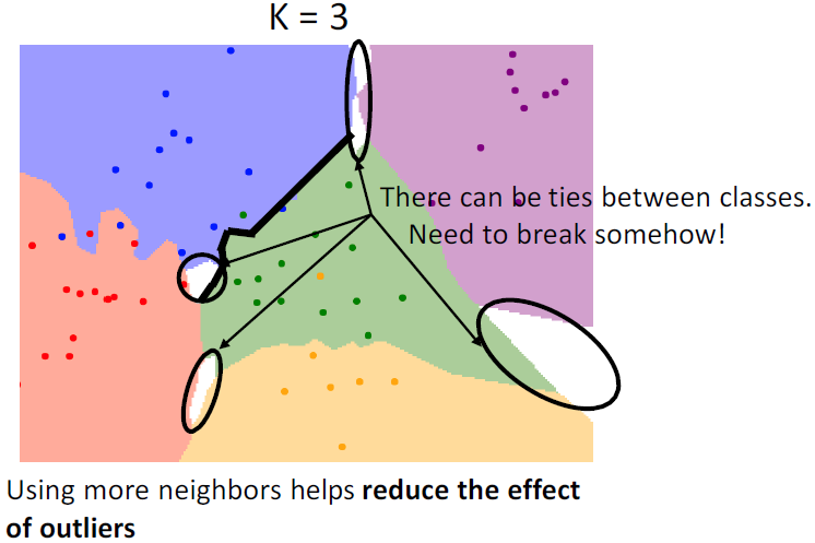 k를 증가시켜 decision boundary를 좀 더 부드럽게 만들어줘서 outlier를 처리할 수 있다. 하지만, 아래 그림에서 흰색 부분과 같이 class를 분류하려고 할 때 무승부(예를 들어, 빨간색 초록색 파란색 점이 1개씩)일 경우가 생긴다. 이런 경우, 알고리즘을 추가하여 k=1인 상황으로 만들어 부분적으로 빨간색 초록색 파란색으로 덮는 방법도 있다.